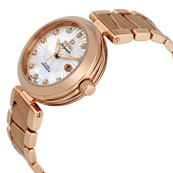 18kt rose gold case with a rose gold-tone 18kt rose gold bracelet. Fixed 18kt rose gold bezel. Mother of pearl dial with rose gold-tone alpha-style shape hands and diamonds hour markers. Dial Type: Analog. Luminescent hands. Date display at the 3 o'clock position. Omega Calibre 8520 Automatic movement, based upon Omega 8500, containing 28 Jewels, bitting at 25200 vph, and has a power reserve of approximately 50 hours. Scratch resistant sapphire crystal. Screw down crown. Skeleton transparent exhibition see through case back. Round case shape, case size: 34 mm, case thickness: 12.3 mm. Deployment with push button release clasp. Water resistant at 100 meters / 330 feet. Functions: date, hour, minute, second, chronometer. Luxury watch style. Watch label: Swiss Made. Item Variations: 425 60 34 20 55 001, 425-60-34-20-55-001, 425/60/34/20/55/001, 42560342055001. Omega De Ville Ladymatic 18K Rose Gold Automatic Ladies Watch 425.60.34.20.55.001.