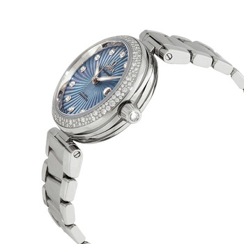 Stainless steel case with a stainless steel bracelet. Fixed stainless steel bezel set with diamond snow. Blue dial with silver-tone hands and diamond hour markers. Dial Type: Analog. Luminescent hands. Date display at the 3 o'clock position. Omega calibre 8520 automatic movement, based upon Omega 8500, containing 28 Jewels, bitting at 25200 vph, and has a power reserve of approximately 50 hours. Scratch resistant sapphire crystal. Screw down crown. Transparent case back. Round case shape, case size: 34 mm. Case thickness: 12.3 mm. Butterfly clasp. Water resistant at 100 meters / 330 feet. Functions: date, hour, minute, second, co-axial escapement, chronometer. Additional Info: 11 diamond hour markers. De Ville Ladymatic Series. Luxury watch style. Watch label: Swiss Made. Omega De Ville Ladymatic Automatic Ladies Watch 425.35.34.20.57.002.