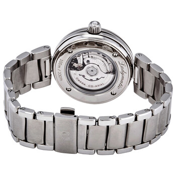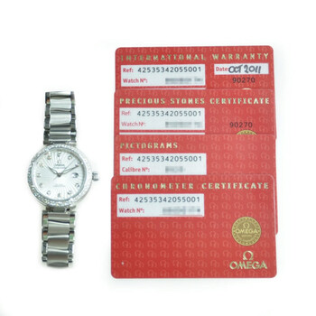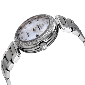 Stainless steel case with a stainless steel bracelet. Fixed stainless steel bezel set with diamonds. Mother of pearl dial with luminous silver-tone hands and diamond hour markers. Dial Type: Analog. Luminescent hands. Date display at the 3 o'clock position. Omega calibre 8520 automatic movement with a 50-hour power reserve. Scratch resistant sapphire crystal. Screw down crown. Solid case back. Round case shape. Case size: 34 mm. Case thickness: 12.3 mm. Fold over clasp with a safety release. Water resistant at 100 meters / 330 feet. Functions: date, hour, minute, second, chronometer. Luxury watch style. Watch label: Swiss Made. Item Variations: 425 35 34 20 55 001, 425-35-34-20-55-001, 425/35/34/20/55/001, 42535342055001. Omega De Ville Ladymatic Automatic Mother of Pearl DialLadies Watch 42535342055001.