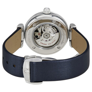 Stainless steel case with a black (satin brushed) leather strap. Fixed stainless steel bezel set with diamonds. Blue dial with luminous silver-tone hands and diamond hour markers. Dial Type: Analog. Luminescent hands. Date display at the 3 o'clock position. Omega calibre 8520 automatic movement with a 50-hour power reserve. Scratch resistant sapphire crystal. Screw down crown. Transparent case back. Case size: 34 mm. Case thickness: 12.3 mm. Round case shape. Deployment clasp with a push button release. Water resistant at 100 meters / 330 feet. Functions: date, hour, minute, second. Luxury watch style. Watch label: Swiss Made. Omega De Ville Ladymatic Blue Dial Ladies Watch 425.37.34.20.56.001.