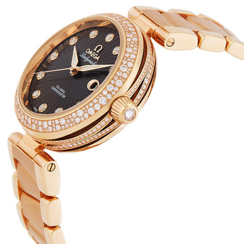 18k rose gold case with a 18k rose gold bracelet. 18k rose gold fixed set with diamonds bezel. Brown dial with rose gold-tone hands and diamond indexes hour markers. Dial Type: Analog. Date display at the 3 o'clock position. Automatic movement. Omega 8521 engine. Scratch resistant sapphire crystal. Screw down crown. Transparent case back. Case diameter: 34 mm. Round case shape. Deployment clasp. Water resistant at 100 meters / 330 feet. Functions: date, hour, minute, second. Luxury watch style. Watch label: Swiss Made. Omega De Ville Ladymatic Brown Dial 18k Rose Gold Ladies Watch 42565342063002.