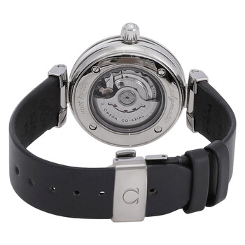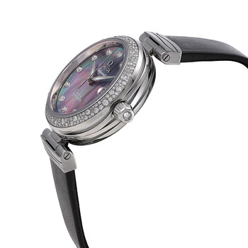 Stainless steel case with a grey leather strap. Fixed stainless steel bezel set with diamonds. Black mother of pearl dial with luminous silver-tone hands and diamond hour markers. Dial Type: Analog. Luminescent hands. Date display at the 3 o'clock position. Omega calibre 8520 automatic movement, based upon Omega 8500, containing 28 Jewels, bitting at 25200 vph, and has a power reserve of approximately 50 hours. Scratch resistant sapphire crystal. Screw down crown. Transparent case back. Round case shape. Case size: 34 mm. Case thickness: 12.3 mm. Band width: 16 mm. Fold over clasp with a push button release. Water resistant at 100 meters / 330 feet. Functions: date, hour, minute, second, co-axial escapement, chronometer. De Ville Ladymatic Series. Luxury watch style. Watch label: Swiss Made. Omega De Ville Ladymatic Chronometer Diamond Watch 425.37.34.20.57.004.