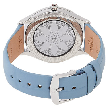 Silver-tone stainless steel with diamond set case with a blue leather strap. Fixed silver-tone stainless steel bezel. Blue dial with silver-tone hands and Roman numeral hour markers. Dial Type: Analog. Omega Calibre 4061 quartz movement. Scratch resistant sapphire crystal. Solid case back. Round case shape, case size: 26 mm, case thickness: 7.5 mm. Band width: 13 mm. Pin buckle clasp. Water resistant at 30 meters / 100 feet. Functions: hour, minute. De Ville Mini Tresor Series. Dress watch style. Watch label: Swiss Made. Omega De Ville Mini Tresor Quartz Blue Dial Ladies Watch 428.18.36.60.03.002.