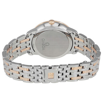 Stainless steel case with a stainless steel bracelet with 18kt rose gold links. Fixed 18kt rose gold bezel set with diamonds. Mother of pearl dial with rose gold-tone hands and diamond hour markers. Roman numerals mark the 3, 6, 9 and 12 o'clock posirion. Dial Type: Analog. Date display at the 3 o'clock position. Omega calibre 2500 automatic movement with a 48-hour power reserve. Scratch resistant sapphire crystal. Pull / push crown. Solid case back. Case size: 32.7 mm. Case thickness: 9.5 mm. Round case shape. Band width: 16 mm. Fold over clasp. Water resistant at 30 meters / 100 feet. Functions: date, hour, minute, second, chronometer. Luxury watch style. Watch label: Swiss Made. Omega De Ville Mother of Pearl Diamond Dial Ladies Watch 424.25.33.20.55.002.