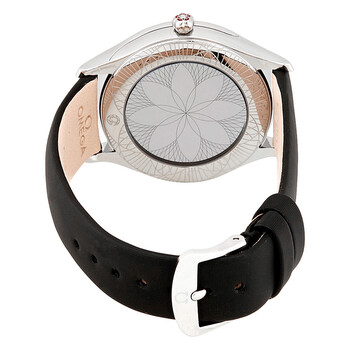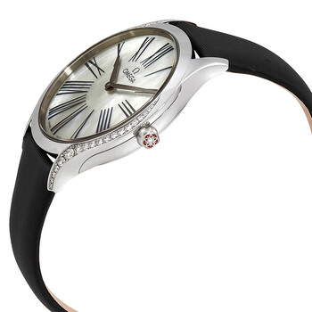 Stainless steel case with a black fabric strap. Fixed stainless steel bezel set with diamonds. Mother of pearl dial with black hands and Roman numeral hour markers. Dial Type: Analog. Omega calibre 4061 quartz movement. Scratch resistant sapphire crystal. Pull / push crown. Solid case back. Round case shape. Case size: 36 mm. Band width: 18 mm. Tang clasp. Water resistant at 30 meters / 100 feet. Functions: hour, minute. Luxury watch style. Watch label: Swiss Made. Omega De Ville Mother of Pearl Ladies Watch 428.17.36.60.05.001.