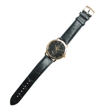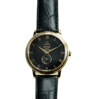 18kt rose gold case with a black leather strap. Fixed 18kt rose gold bezel. Black dial with gold-tone dauphine-style shape hands and Roman numeral hour markers. Dial Type: Analog. Luminescent hands. One subdial displaying: small second. Omega Calibre 2202 Automatic movement, containing 27 Jewels, bitting at 25200 vph, and has a power reserve of approximately 48 hours. Scratch resistant sapphire crystal. Solid case back. Round case shape, case size: 39 mm. Pin buckle clasp. Water resistant at 30 meters / 100 feet. Functions: hour, minute, small second, co-axial escapement, chronometer. De Ville Prestige Series. Luxury watch style. Watch label: Swiss Made. Item Variations: 4614 50 01, 4614-50-01, 4614/50/01, 46145001. Omega De Ville Prestige 18kt Rose Gold Automatic Chronometer Watch 4614.50.01.