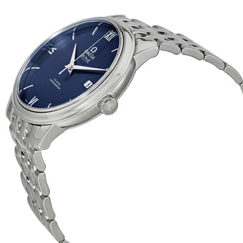 Stainless steel case with a stainless steel bracelet. Fixed stainless steel bezel. Blue dial with silver-tone dauphine-style hands and index hour markers. Roman numerals mark the 3, 6, 9 and 12 o'clock positions. Dial Type: Analog. Date display at the 3 o'clock position. Omega calibre 2500 automatic movement, based upon ETA 2892-A2, containing 27 Jewels, bitting at 25200 vph, and has a power reserve of approximately 48 hours. Scratch resistant sapphire crystal. Pull / push crown. Solid case back. Round case shape. Case size: 39.5 mm. Case thickness: 10 mm. Band width: 20 mm. Hidden fold over clasp. Water resistant at 30 meters / 100 feet. Functions: date, hour, minute, second, co-axial escapement, chronometer. Luxury watch style. Watch label: Swiss Made. Omega De Ville Prestige Automatic Blue Dial Men's Watch 424.10.40.20.03.001.