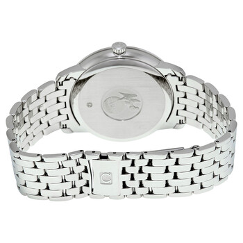 Stainless steel case with a stainless steel bracelet. Fixed stainless steel bezel. Blue dial with silver-tone dauphine-style hands and alternating Roman numeral and dot hour markers. Minute markers around the outer rim. Dial Type: Analog. Date display at the 3 o'clock position. Omega calibre 2500 automatic movement, based upon ETA 2892-A2, containing 27 Jewels, bitting at 25200 vph, and has a power reserve of approximately 48 hours. Scratch resistant sapphire crystal. Pull / push crown. Solid case back. Round case shape. Case size: 39.5 mm. Case thickness: 10 mm. Band width: 20 mm. Fold over clasp. Water resistant at 30 meters / 100 feet. Functions: date, hour, minute, second, co-axial escapement, chronometer. Luxury watch style. Watch label: Swiss Made. Omega De Ville Prestige Automatic Blue Dial Men's Watch 424.10.40.20.03.002.