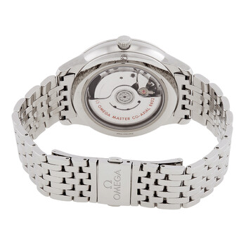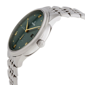 Silver-tone stainless steel case and bracelet. Fixed silver-tone stainless steel bezel. Green dial with gold-tone hands and Roman numeral-index hour markers. Minute markers around the outer rim. Dial Type: Analog. One subdial displaying: small second. Omega Calibre 8802 Automatic movement, based upon Omega 8800, containing 35 Jewels, bitting at 25200 vph, and has a power reserve of approximately 55 hours. Scratch resistant sapphire crystal. Transparent case back. Round case shape, case size: 41 mm, case thickness: 10.8 mm. Band width: 19 mm. Butterfly clasp. Water resistant at 30 meters / 100 feet. Functions: date, hour, minute, small second, co-axial escapement, chronometer, magnetic resistant. De Ville Prestige Series. Luxury watch style. Watch label: Swiss Made. Omega De Ville Prestige Automatic Chronometer Green Dial Men's Watch 434.10.41.20.10.001.