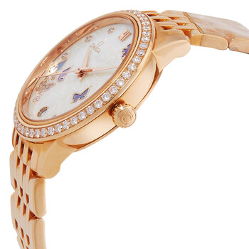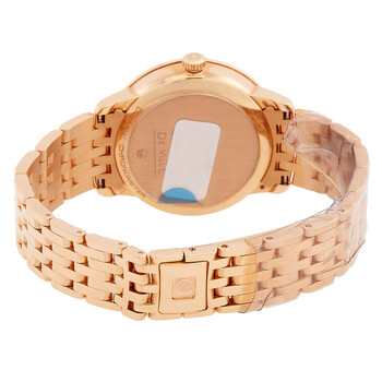 18kt rose gold case with a 18kt rose gold bracelet. Fixed diamond set bezel. White mother of pearl dial with gold-tone hands and diamond hour markers. Dial Type: Analog. Date display at the 6 o'clock position. Omega Calibre 2500 automatic movement with a 48-hour power reserve. Scratch resistant sapphire crystal. Case size: 32.7 mm. Round case shape. Water resistant at 30 meters / 100 feet. Functions: date, hour, minute, second, co-axial escapement, chronometer. Luxury watch style. Watch label: Swiss Made. Omega De Ville Prestige Automatic Ladies Watch 424.55.33.20.55.004.