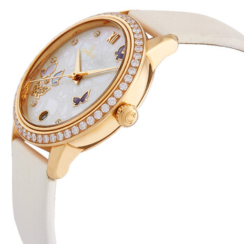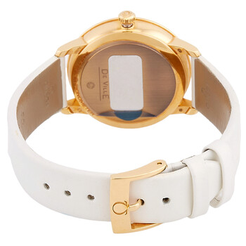18kt yellow gold case with a white satin-brushed leather strap. Diamond set bezel. White mother of pearl dial with gold-tone hands and diamond hour markers. Dial Type: Analog. Date display at the 6 o'clock position. Omega Calibre 2500 automatic movement with a 48-hour power reserve. Scratch resistant sapphire crystal. Case size: 32.7 mm. Round case shape. Band width: 16 mm. Water resistant at 30 meters / 100 feet. Functions: date, hour, minute, second, co-axial escapement, chronometer. Luxury watch style. Watch label: Swiss Made. Omega De Ville Prestige Automatic Ladies Watch 424.57.33.20.55.003.