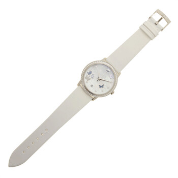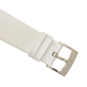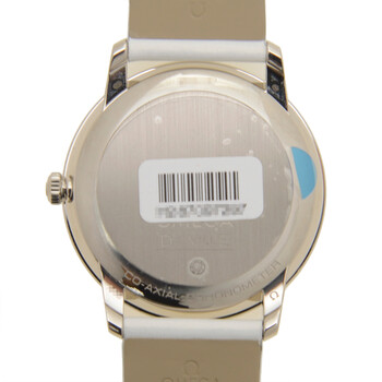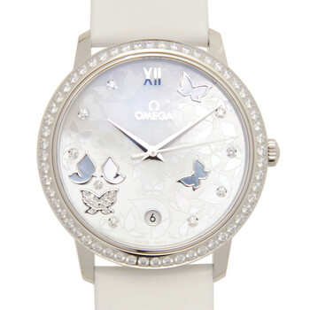 18kt white gold case with a white satin-brushed leather strap. Fixed 18kt white gold bezel with diamond set. White mother of pearl dial with white hands and diamond hour markers. Dial Type: Analog. Date display at the 6 o'clock position. Omega Calibre 2500 Automatic movement, based upon ETA 2892-A2, containing 27 Jewels, bitting at 25200 vph, and has a power reserve of approximately 48 hours. Scratch resistant sapphire crystal. Pull / push crown. Round case shape, case size: 36.8 mm. Band width: 19 mm. Water resistant at 30 meters / 100 feet. Functions: date, hour, minute, second, co-axial escapement, chronometer. De Ville Prestige Series. Luxury watch style. Watch label: Swiss Made. Omega De Ville Prestige Automatic Ladies Watch 424.57.37.20.55.002.