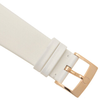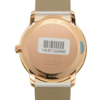 18kt rose gold case with a white satin-brushed leather strap. Fixed 18kt rose gold bezel with diamond set. White mother of pearl dial with gold-tone hands and diamond hour markers. Dial Type: Analog. Date display at the 6 o'clock position. Omega Calibre 2500 Automatic movement, based upon ETA 2892-A2, containing 27 Jewels, bitting at 25200 vph, and has a power reserve of approximately 48 hours. Scratch resistant sapphire crystal. Pull / push crown. Round case shape, case size: 36.8 mm. Band width: 19 mm. Water resistant at 30 meters / 100 feet. Functions: date, hour, minute, second, co-axial escapement, chronometer. De Ville Prestige Series. Luxury watch style. Watch label: Swiss Made. Omega De Ville Prestige Automatic Ladies Watch 424.57.37.20.55.003.