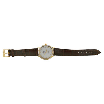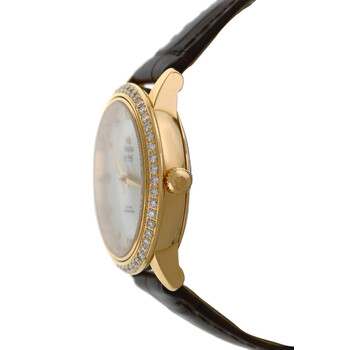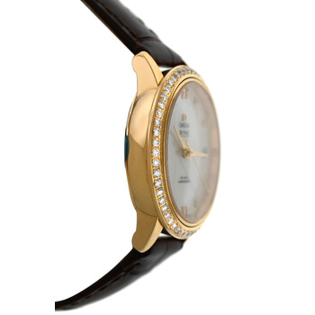 18kt yellow gold case with a brown leather strap. Diamond set bezel. White mother of pearl dial with gold-tone hands and Roman numeral and diamond hour markers. Dial Type: Analog. Date display at the 3 o'clock position. Omega Calibre 2500 automatic movement with a 48-hour power reserve. Scratch resistant sapphire crystal. Case size: 32.7 mm. Round case shape. Band width: 16 mm. Water resistant at 30 meters / 100 feet. Functions: date, hour, minute, second, co-axial escapement, chronometer. Luxury watch style. Watch label: Swiss Made. Omega De Ville Prestige Automatic Ladies Watch 424.58.33.20.55.002.