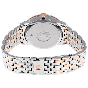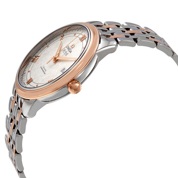 Stainless steel case with a stainless steel bracelet with 18kt rose gold links. Fixed 18kt rose gold bezel. Grey textured (silk patterned) dial with rose gold-tone dauphine-style hands and alternating Roman numeral and dot hour markers. Minute markers around the outer rim. Dial Type: Analog. Date display at the 3 o'clock position. Omega calibre 2500 automatic movement, based upon ETA 2892-A2, containing 27 Jewels, bitting at 25200 vph, and has a power reserve of approximately 48 hours. Scratch resistant sapphire crystal. Pull / push crown. Solid case back. Round case shape. Case size: 39.5 mm. Band width: 20 mm. Fold over clasp. Water resistant at 30 meters / 100 feet. Functions: date, hour, minute, second, co-axial escapement, chronometer. De Ville Prestige Series. Luxury watch style. Watch label: Swiss Made. Omega De Ville Prestige Automatic Steel and 18kt Rose Gold Men's Watch 424.20.40.20.02.002.