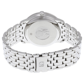 Stainless steel case with a stainless steel bracelet. Fixed stainless steel bezel. Silver dial with rose gold-tone hands and alternating Roman numeral and dot hour markers. Minute markers around the outer rim. Dial Type: Analog. Date display at the 3 o'clock position. Omega calibre 2500 automatic movement, based upon ETA 2892-A2, containing 27 Jewels, bitting at 25200 vph, and has a power reserve of approximately 48 hours. Scratch resistant sapphire crystal. Pull / push crown. Solid case back. Round case shape. Case size: 36.8 mm. Case thickness: 15 mm. Band width: 19 mm. Fold over clasp with a push button release. Water resistant at 30 meters / 100 feet. Functions: date, hour, minute, second, co-axial escapement, chronometer. Luxury watch style. Watch label: Swiss Made. Omega De Ville Prestige Automatic Unisex Watch 424.10.37.20.02.002.