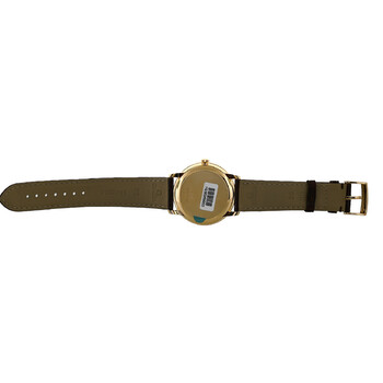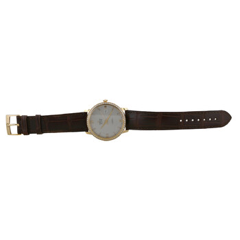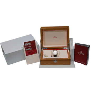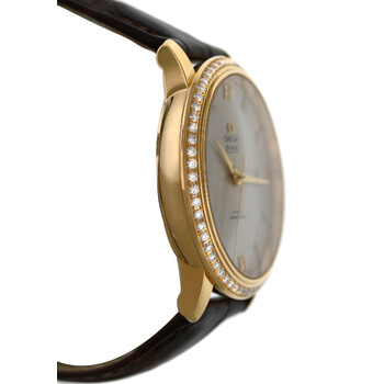 18kt yellow gold case with a brown leather strap. Diamond set bezel. Silver dial with gold-tone hands and Roman numeral and diamond hour markers. Dial Type: Analog. Date display at the 3 o'clock position. Omega Calibre 2500 automatic movement with a 48-hour power reserve. Scratch resistant sapphire crystal. Case size: 39.5 mm. Round case shape. Band width: 20 mm. Water resistant at 30 meters / 100 feet. Functions: date, hour, minute, second, co-axial escapement, chronometer. Luxury watch style. Watch label: Swiss Made. Omega De Ville Prestige Automatic Watch 424.58.40.20.52.001.