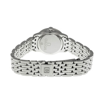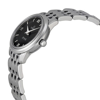 Stainless steel case with a stainless steel bracelet. Fixed stainless steel bezel. Black dial with silver-tone hands and index hour markers. Roman numerals mark the 3, 6, 9 and 12 o'clock positions. Dial Type: Analog. Omega calibre 1376 quartz movement with a 48 months power reserve. Scratch resistant sapphire crystal. Pull / push crown. Solid case back. Round case shape. Case size: 24.4 mm. Case thickness: 6 mm. Band width: 12 mm. Fold over clasp with a push button release. Water resistant at 30 meters / 100 feet. Functions: hour, minute. Luxury watch style. Watch label: Swiss Made. Omega De Ville Prestige Black Dial Ladies Watch 42410246001001.