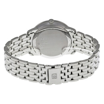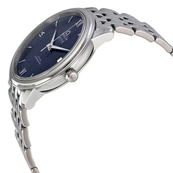 Stainless steel case with a stainless steel bracelet. Fixed stainless steel bezel. Blue dial with silver-tone dauphine-style hands and index hour markers. Roman numeral marks the 3, 6, 9 and 12 o'clock position. Dial Type: Analog. Date display at the 3 o'clock position. Omega calibre 2500 automatic movement, based upon ETA 2892-A2, containing 27 Jewels, bitting at 25200 vph, and has a power reserve of approximately 48 hours. Scratch resistant sapphire crystal. Pull / push crown. Solid case back. Round case shape, Case size: 36.8 mm. Case thickness: 10 mm. Band width: 21.6 mm. Band length: 8.5 inches. Deployment clasp with a push button release. Water resistant at 30 meters / 100 feet. Functions: date, hour, minute, second, co-axial escapement, chronometer. Luxury watch style. Watch label: Swiss Made. Item Variations: 42410372003001. Omega De Ville Prestige Blue Dial Men's Watch 424.10.37.20.03.001.