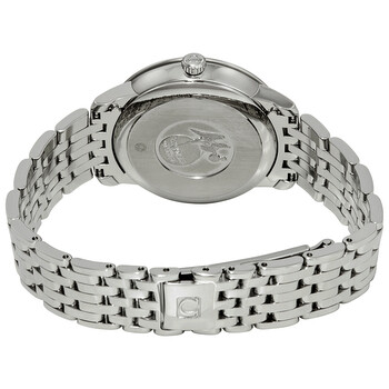 Stainless steel case with a stainless steel bracelet. Fixed stainless steel bezel. Blue mother of pearl dial with silver-tone dauphine-style hands and alternating Roman numeral and diamond hour markers. Minute markers around the outer rim. Dial Type: Analog. Date display at the 6 o'clock position. Omega calibre 2500 automatic movement, based upon ETA 2892-A2, containing 27 Jewels, bitting at 25200 vph, and has a power reserve of approximately 48 hours. Scratch resistant sapphire crystal. Pull / push crown. Solid case back. Round case shape. Case size: 32.7 mm. Band width: 16 mm. Fold over clasp with a push button release. Water resistant at 30 meters / 100 feet. Functions: date, hour, minute, second, co-axial escapement, chronometer. De Ville Prestige Series. Luxury watch style. Watch label: Swiss Made. Omega De Ville Prestige Blue Mother of Pearl Diamond Dial Ladies Watch 424.10.33.20.57.001.