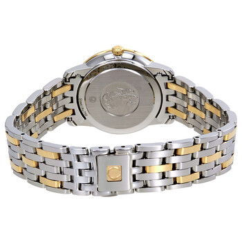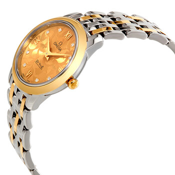Stainless steel case with a stainless steel bracelet with 18kt yellow gold links. Fixed 18kt yellow gold bezel. Champagne dial with gold-tone dauphine-style hands and diamond hour markers. Roman numerals appear at the 3, 6, 9 and 12 o'clock positions. Dial Type: Analog. Omega calibre 1376 quartz movement with a 48 months power reserve. Scratch resistant sapphire crystal. Pull / push crown. Solid case back. Round case shape. Case size: 27.4 mm. Case thickness: 7 mm. Fold over clasp with a safety release. Water resistant at 30 meters / 100 feet. Functions: hour, minute. De Ville Prestige Butterfly Series. Luxury watch style. Watch label: Swiss Made. Item Variations: 424 20 27 60 58 002, 424-20-27-60-58-002, 424/20/27/60/58/002, 42420276058002. Omega De Ville Prestige Butterfly Champagne Diamond Dial Ladies Watch 424.20.27.60.58.002.