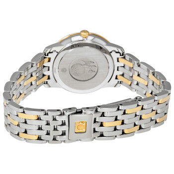 Silver-tone stainless steel case with a two-tone (silver-tone and gold-tone) stainless steel with 18kt yellow gold bracelet. Fixed 18kt yellow gold bezel. Champagne dial with gold-tone dauphine-style shape hands and diamond and Roman numeral hour markers. Minute markers around the outer rim. Dial Type: Analog. Omega Calibre 1376 quartz movement with a 48 months power reserve. Scratch resistant sapphire crystal. Pull / push crown. Solid case back. Round case shape, case size: 27.4 mm. Band width: 14 mm. Deployment clasp. Water resistant at 30 meters / 100 feet. Functions: hour, minute. De Ville Prestige Series. Luxury watch style. Watch label: Swiss Made. Omega De Ville Prestige Champagne Dial Ladies Watch 424.20.27.60.58.003.