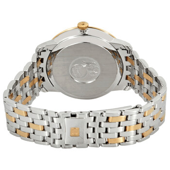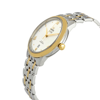 Stainless steel case with a stainless steel bracelet with 18kt yellow gold links. Fixed 18kt yellow gold bezel. Silvery sun-brushed dial with yellow gold hands and alternating Roman numeral and cabochon hour markers. Minute markers around the outer rim. Dial Type: Analog. Date display above the 6 o'clock position. Co-Axial calibre 2500 automatic movement. Domed, scratch-resistant sapphire crystal. Solid case back. Round case shape. Case size: 39.5 mm. Case thickness: 10 mm. Band width: 20 mm. Fold over clasp with a safety release. Water resistant at 30 meters / 100 feet. Functions: chronometer, date, hour, minute, second. De Ville Prestige Series. Luxury watch style. Watch label: Swiss Made. Omega De Ville Prestige Chronometer Automatic Silvery Sun-brushed Dial Men's Watch 42420402002006.