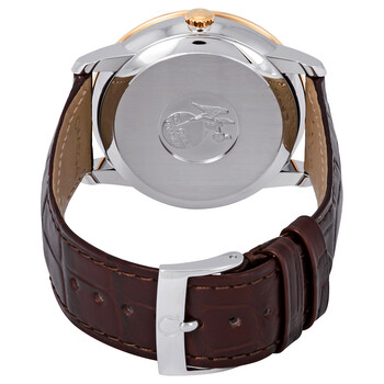 Stainless steel case with a brown leather strap. Fixed 18kt yellow gold bezel. Champagne dial with yellow gold-tone hands and alternating diamond with Roman numeral hour markers. Minute markers around the outer rim. Dial Type: Analog. Date display at the 3 o'clock position. Two sub-dials displaying: small seconds and power reserve. Omega calibre 2627 automatic movement with a 48-hour power reserve. Scratch resistant sapphire crystal. Pull / push crown. Solid case back. Round case shape. Case size: 39.5 mm. Band width: 20 mm. Tang clasp. Water resistant at 30 meters / 100 feet. Functions: date, hour, minute, second. Additional Info: set of 6 diamonds on dial. Dress watch style. Watch label: Swiss Made. Omega De Ville Prestige Co-Axial Automatic Diamond Champagne Dial Men's Watch 424.23.40.21.08.001.