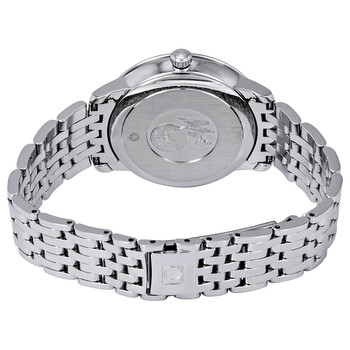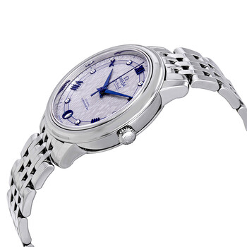 Stainless steel case with a stainless steel bracelet. Fixed stainless steel bezel. Grey dial with blue dauphine-style hands and alternating diamond and Roman numeral hour markers. Minute markers around the outer rim. Dial Type: Analog. Date display at the 6 o'clock position. Omega calibre 2500 automatic movement, based upon ETA 2892-A2, containing 27 Jewels, bitting at 25200 vph, and has a power reserve of approximately 48 hours. Scratch resistant sapphire crystal. Pull / push crown. Solid case back. Round case shape. Case size: 32.7 mm. Band width: 16 mm. Hidden fold over clasp. Water resistant at 30 meters / 100 feet. Functions: date, hour, minute, second, co-axial escapement, chronometer. Additional Info: set of 6 diamonds on dial. De Ville Series. Dress watch style. Watch label: Swiss Made. Omega De Ville Prestige Co-Axial Automatic Diamond Grey Dial Ladies Watch 424.10.33.20.56.002.