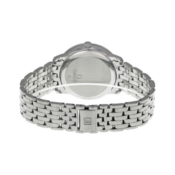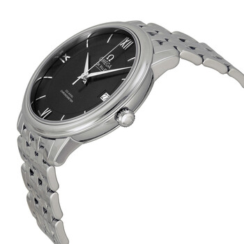 Stainless steel case with a stainless steel bracelet. Fixed stainless steel bezel. Black dial with silver-tone dauphine-style hands and index hour markers. Roman numerals mark the 3, 6, 9 and 12 o'clock positions. Dial Type: Analog. Date display at the 3 o'clock position. Omega calibre 2500 automatic movement, based upon ETA 2892-A2, containing 27 Jewels, bitting at 25200 vph, and has a power reserve of approximately 48 hours. Scratch resistant sapphire crystal. Pull / push crown. Solid case back. Round case shape. Case size: 36.8 mm. Case thickness: 10 mm. Band width: 20 mm, band length: 8 inches. Fold over clasp. Water resistant at 30 meters / 100 feet. Functions: date, hour, minute, second, co-axial escapement, chronometer. De Ville Prestige Series. Luxury watch style. Watch label: Swiss Made. Item Variations: 424 10 37 20 01 001, 424-10-37-20-01-001, 424/10/37/20/01/001, 42410372001001. Omega De Ville Prestige Co-Axial Automatic Unisex Watch 424.10.37.20.01.001.