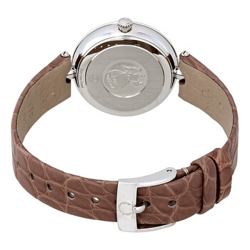 Stainless steel case with a brown leather strap. Fixed stainless steel bezel set with diamonds. Silver dial with silver-tone hands and diamond hour markers. Roman numerals mark the 3, 6, 9 and 12 o'clock positions. Dial Type: Analog. Omega calibre 4061 quartz movement. Scratch resistant sapphire crystal. Pull / push crown. Solid case back. Round case shape. Case size: 27.4 mm. Band width: 12 mm. Tang clasp. Water resistant at 30 meters / 100 feet. Functions: hour, minute. Luxury watch style. Watch label: Swiss Made. Omega De Ville Prestige Diamond Ladies Watch 424.18.27.60.52.001.