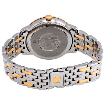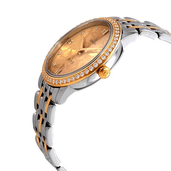 Stainless steel case with a stainless steel bracelet with 18kt yellow gold links. Fixed 18kt yellow gold bezel set with diamonds. Gold dial with yellow gold-tone hands and diamond hour markers. Roman numerals mark the 3, 6, 9 and 12 o'clock positions. Dial Type: Analog. Omega calibre 4061 quartz movement. Scratch resistant sapphire crystal. Solid case back. Round case shape. Case size: 32.7 mm. Fold over clasp. Water resistant at 30 meters / 100 feet. Functions: hour, minute. Luxury watch style. Watch label: Swiss Made. Omega De Ville Prestige Diamond Ladies Watch 424.25.33.60.58.001.