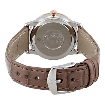 Stainless steel case with a brown leather strap. Fixed 18kt rose gold bezel. Silver-tone dial with rose gold-tone hands and alternating diamond and Roman numeral hour markers. Minute markers around the outer rim. Dial Type: Analog. Omega calibre 1376 quartz movement. Scratch resistant sapphire crystal. Pull / push crown. Solid case back. Round case shape. Case size: 27.4 mm. Band width: 14 mm. Tang clasp. Water resistant at 30 meters / 100 feet. Functions: hour, minute. Additional Info: set of 6 diamonds on dial. Dress watch style. Watch label: Swiss Made. Omega De Ville Prestige Diamond Silver Dial Ladies Watch 424.23.27.60.52.001.