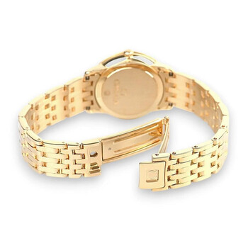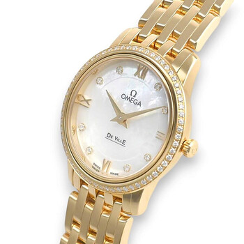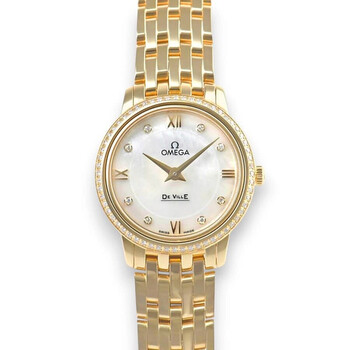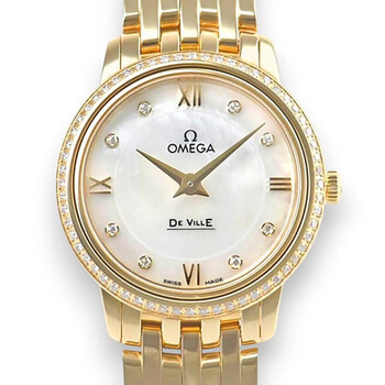 18kt yellow gold case with a polished 18kt yellow gold bracelet. Fixed 18kt yellow gold bezel with diamond set. White mother-of-pearl dial with gold-tone hands and diamond and Roman numeral hour markers. Dial Type: Analog. Omega Calibre 1376 quartz movement. Scratch resistant sapphire crystal. Pull / push crown. Solid case back. Round case shape, case size: 27.4 mm. Band width: 14 mm. Push button folding clasp. Water resistant at 30 meters / 100 feet. Functions: hour, minute. De Ville Prestige Series. Luxury watch style. Watch label: Swiss Made. Omega De Ville Prestige Ladies Watch 424.55.27.60.55.001.