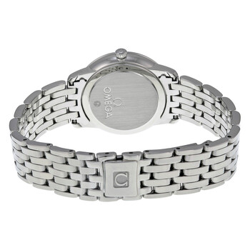 Stainless steel case with a stainless steel bracelet. Fixed stainless steel bezel. Mother of pearl dial with silver-tone hands and stick hour markers. Roman numerals mark the 3, 6, 9 and 12 o'clock positions. Dial Type: Analog. Quartz movement. Scratch resistant sapphire crystal. Solid case back. Case diameter: 27.4 mm. Round case shape. Band width: 14.5 mm. Deployment clasp with a push button release. Water resistant at 30 meters / 100 feet. Functions: hour, minute. Luxury watch style. Watch label: Swiss Made. Omega De Ville Prestige Mother of Pearl Dial Ladies Watch 424.10.27.60.05.001.