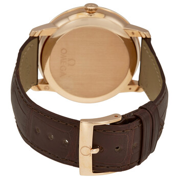 18kt rose gold case with a brown alligator leather strap. Fixed 18kt rose gold bezel. Silver dial with rose gold dauphine-style shape hands and index hour markers. Roman numerals appear at the 3, 6, 9 and 12 o'clock positions. Dial Type: Analog. Date display at the 3 o'clock position. Two sub-dials displaying: small second and power reserve indicator. Omega Calibre 2627 Automatic movement, based upon Omega 2500, containing 29 Jewels, bitting at 25200 vph, and has a power reserve of approximately 48 hours. Scratch resistant sapphire crystal. Pull / push crown. Solid case back. Round case shape, case size: 39.5 mm. Band width: 20 mm. Tang clasp. Water resistant at 30 meters / 100 feet. Functions: date, hour, minute, second, power reserve indicator, co-axial escapement, chronometer. De Ville Series. Luxury watch style. Watch label: Swiss Made. Omega De Ville Prestige Silver Dial 18klt Rose Gold Automatic Men's Watch 42453402102001.