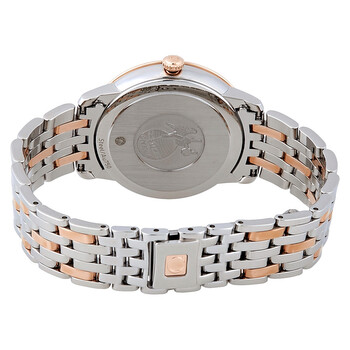 Stainless steel case with a stainless steel bracelet with 18kt rose gold links. Fixed 18kt rose gold bezel. Silver (butterfly) dial with rose gold-tone hands and diamond hour markers. Roman numerals mark the 3, 6, 9 and 12 o'clock positions. Dial Type: Analog. Omega calibre 4061 quartz movement. Scratch resistant sapphire crystal. Pull / push crown. Solid case back. Round case shape. Case size: 32.7 mm. Band width: 16 mm. Hidden fold over clasp. Water resistant at 30 meters / 100 feet. Functions: hour, minute. De Ville Prestige Series. Luxury watch style. Watch label: Swiss Made. Omega De Ville Prestige Silver Diamond Dial Ladies Watch 424.20.33.60.52.001.