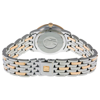 Stainless steel case with a stainless steel bracelet with 18kt rose gold links. Fixed 18kt rose gold bezel. Silver mother of pearl (butterfly pattern) dial with rose gold-tone dauphine-style hands and diamond hour markers. Roman numerals mark the 3, 6, 9 and 12 o'clock positions. Dial Type: Analog. Omega calibre 1376 quartz movement with a 48 months power reserve. Scratch resistant sapphire crystal. Pull / push crown. Solid case back. Round case shape. Case size: 27.4 mm. Case thickness: 7 mm. Band width: 15 mm. Band length: 6 inches. Deployment clasp. Water resistant at 30 meters / 100 feet. Functions: hour, minute. De Ville Series. Luxury watch style. Watch label: Swiss Made. Omega De Ville Prestige Silver Diamond Dial Stainless Steel and 18kt Rose Gold Ladies Watch 42420276052002.