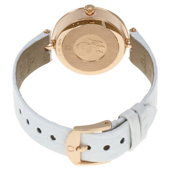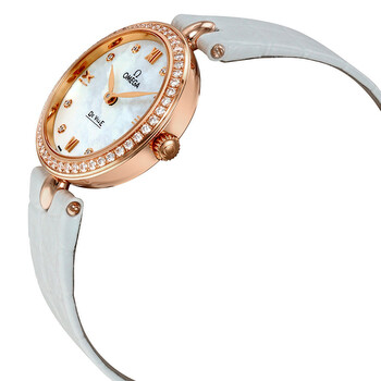 18kt rose gold case with a white (alligator) leather strap. Fixed 18kt rose gold bezel set with diamonds. White mother of pearl dial with rose gold-tone hands and diamond hour markers. Roman numerals mark the 3, 6, 9 and 12 o'clock positions. Dial Type: Analog. Omega calibre 4061 quartz movement. Scratch resistant sapphire crystal. Pull / push crown. Solid case back. Round case shape. Case size: 27.4 mm. Band width: 12 mm. Tang clasp. Water resistant at 30 meters / 100 feet. Functions: hour, minute. De Ville) Prestige Series. Luxury watch style. Watch label: Swiss Made. Omega De Ville Prestige White Mother of Pearl Dial Ladies Watch 424.58.27.60.55.002.