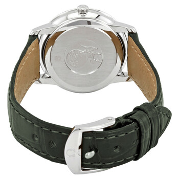 Stainless steel case with a hunter green leather strap. Fixed stainless steel bezel. White silvery (opaline finish) dial with black dauphine-style hands and alternating Roman numeral and diamond hour markers. Minute markers around the outer rim. Dial Type: Analog. Omega calibre 1376 quartz movement. Scratch resistant sapphire crystal. Pull / push crown. Solid case back. Round case shape. Case size: 27.4 mm. Band width: 14 mm. Tang clasp. Water resistant at 30 meters / 100 feet. Functions: hour, minute. De Ville Prestige Series. Luxury watch style. Watch label: Swiss Made. Omega De Ville Prestige White Silvery Diamond Dial Ladies Watch 424.13.27.60.52.002.