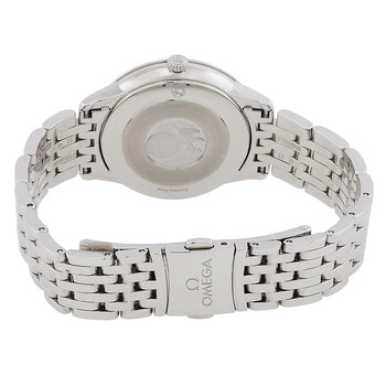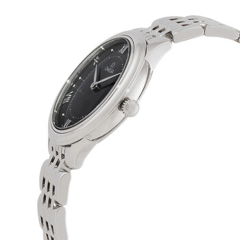 Silver-tone stainless steel case and bracelet. Fixed silver-tone stainless steel bezel. Black dial with silver-tone hands and Roman numeral hour markers. Minute markers around the outer rim. Dial Type: Analog. Omega Calibre 4061 quartz movement. Scratch resistant sapphire crystal. Solid case back. Round case shape, case size: 30 mm. Fold over clasp with a safety release. Water resistant at 30 meters / 100 feet. Functions: hour, minute. Additional Info: original box, international warranty card, manual (complete accessories). De Ville Series. Luxury watch style. Watch label: Swiss Made. Omega De Ville Quartz Black Dial Ladies Watch 434.10.30.60.01.001.