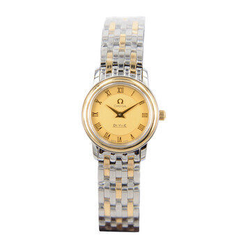 18kt gold case with a silver-tone 18kt gold bracelet. Fixed gold-tone 18kt gold bezel. Gold tone dial with gold-tone hands and Roman numeral hour markers. Dial Type: Analog. Quartz movement. Scratch resistant sapphire crystal. Screw down crown. Solid case back. Round case shape. Case size: 22 mm. Deployment clasp. Functions: hour, minute. Additional Info: original box, international warranty card, manual (complete accessories). Luxury watch style. Watch label: Swiss Made. Omega DE VILLE Gold Tone Dial Unisex Watch 43701200.