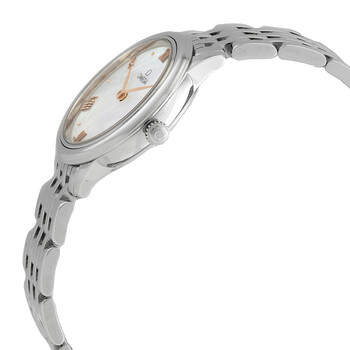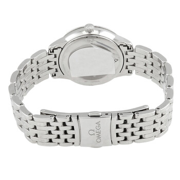 Silver-tone stainless steel case and bracelet. Fixed silver-tone stainless steel bezel. White mother of pearl dial with PVD sedna gold hands and alternating Roman numeral and cabochon index hour markers. Dial Type: Analog. Omega Calibre 4061 quartz movement. Scratch resistant sapphire crystal. Pull / push crown. Solid case back. Round case shape, case size: 27.5 mm, case thickness: 6.3 mm. Band width: 13 mm. Butterfly clasp. Water resistant at 30 meters / 100 feet. Functions: hour, minute. De Ville Series. Luxury watch style. Watch label: Swiss Made. Omega De Ville Quartz White Mother of Pearl Dial Ladies Watch 434.10.28.60.05.001.