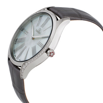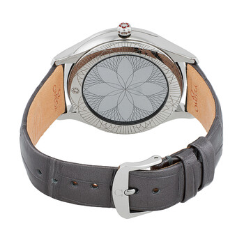 Silver-tone stainless steel with diamonds case with a grey alligator/crocodile leather strap. Fixed stainless steel bezel. White mother of pearl dial with rhodium-plated hands and Roman numeral hour markers. Dial Type: Analog. Omega Calibre 4061 quartz movement. Scratch resistant sapphire crystal. Pull / push crown. Solid case back. Round case shape, case size: 39 mm. Band width: 19 mm. Tang clasp. Water resistant at 30 meters / 100 feet. Functions: hour, minute. De Ville Tresor Series. Luxury watch style. Watch label: Swiss Made. Omega De Ville Tresor Quartz White Mother of Pearl Dial Men's Watch 428.18.39.60.05.001.