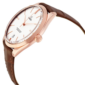 18kt sedna (rose) gold case with a brown (alligator) leather strap. Fixed 18kt sedna (rose) gold bezel. Silver dial with rose gold-tone hands and index hour markers. Minute markers around the outer rim. Dial Type: Analog. Date display at the 6 o'clock position. Omega calibre 8511 hand wind movement, containing 39 Jewels, bitting at 25200 vph, and has a power reserve of approximately 60 hours. Scratch resistant sapphire crystal. Pull / push crown. Transparent case back. Round case shape. Case size: 40 mm. Case thickness: 10.5 mm. Band width: 20 mm. Tang clasp. Water resistant at 30 meters / 100 feet. Functions: date, hour, minute, second, co-axial escapement, chronometer. De Ville Tresor Series. Luxury watch style. Watch label: Swiss Made. Omega De Ville Tresor Silver Dial 18k Sedna Rose Gold Men's Watch 432.53.40.21.02.002.