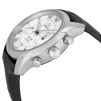 Stainless steel case with a black (alligator) leather strap. Fixed stainless steel bezel. White dial with silver-tone hands and Roman numeral hour markers. Minute markers a. Dial Type: Analog. Luminescent hands and markers. Date display at the 6 o'clock position. Chronograph - two sub-dials displaying: 60 second and 60 minute. Omega calibre 9300 automatic movement with a 60-hour power reserve. Scratch resistant sapphire crystal. Pull / push crown. Transparent case back. Round case shape. Case size: 42 mm. Band width: 21 mm. Band length: 9 inches. Tang clasp. Water resistant at 100 meters / 330 feet. Functions: chronograph, date, hour, minute, second, chronometer. Luxury watch style. Watch label: Swiss Made. Item Variations: 431 13 42 51 02 001, 431-13-42-51-02-001, 431/13/42/51/02/001, 43113425102001. Omega De Ville White Dial Chronograph Men's Watch 431.13.42.51.02.001.
