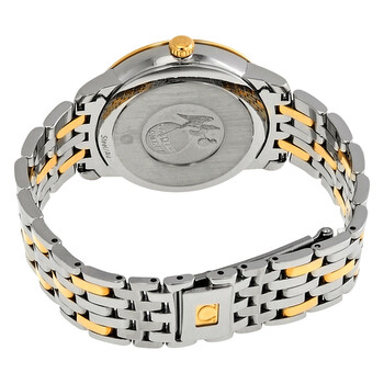 Stainless steel case with a stainless steel bracelet with 18kt yellow gold links. Fixed 18kt yellow gold bezel. Yellow gold dial with gold-tone dauphine-style hands and alternating Roman numeral and diamond hour markers. Minute markers around the outer rim. Dial Type: Analog. Date display at the 6 o'clock position. Omega calibre 2500 automatic movement, based upon ETA 2892-A2, containing 27 Jewels, bitting at 25200 vph, and has a power reserve of approximately 48 hours. Scratch resistant sapphire crystal. Pull / push crown. Solid case back. Round case shape. Case size: 32.7 mm. Case thickness: 10 mm. Band width: 16 mm. Fold over clasp. Water resistant at 30 meters / 100 feet. Functions: date, hour, minute, second, co-axial escapement, chronometer. De Ville Series. Luxury watch style. Watch label: Swiss Made. Omega De Ville Yellow Gold Diamond Dial Steel and 18kt Yellow Gold Ladies Watch 424.20.33.20.58.003.
