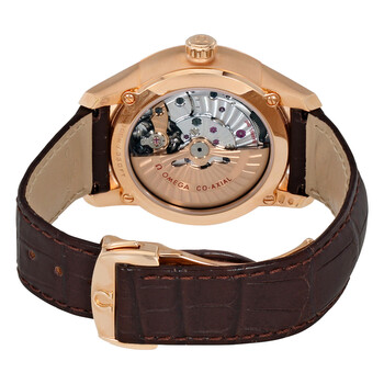 18kt rose gold case with a brown alligator leather strap. Fixed 18kt rose gold bezel. Silver dial with rose red-tone hands and Roman numeral hour markers. Dial Type: Analog. Date display at the 3 o'clock position. Omega caliber 8501 automatic movement with a 60-hour power reserve. Scratch resistant sapphire crystal. Pull / push crown. Transparent case back. Case size: 41 mm. Round case shape. Deployment clasp. Water resistant at 100 meters / 330 feet. Functions: date, hour, minute. Luxury watch style. Watch label: Swiss Made. Item Variations: 431 53 41 21 02 001, 431-53-41-21-02-001, 431/53/41/21/02/001, 43153412102001. Omega DeVille Automatic Men's Watch 431.53.41.21.02.001.