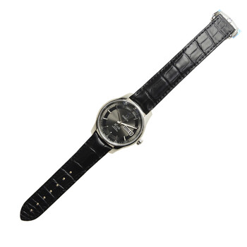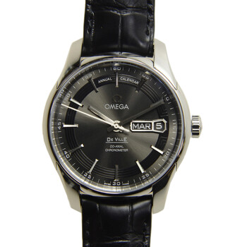 Stainless steel case with a black leather strap. Antracite dial with silver-tone hands and index hour markers. Minute markers around the outer rim. Dial Type: Analog. Date and month displays at the 3 o'clock position. Omega Calibre 8601 automatic movement with a 55-hour power reserve. Domed scratch-resistant sapphire crystal crystal. Case size: 41 mm. Round case shape. Deployment buckle clasp. Water resistant at 100 meters / 330 feet. Functions: annual calendar, month, date, hour, minute, second, chronometer. Luxury watch style. Watch label: Swiss Made. Item Variations: 431.33.41.22.06.001. Omega Deville Hour Vision Men's Watch 431.33.41.22.03.001.