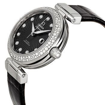 Silver-tone stainless steel case with a black leather strap. Fixed silver-tone diamond set bezel. Black dial with luminous silver-toned alpha-style shape hands and diamond hour markers. Dial Type: Analog. Date display at the 3 o'clock position. Omega Calibre 8520 Automatic movement, based upon Omega 8500, containing 28 Jewels, bitting at 25200 vph, and has a power reserve of approximately 50 hours. Scratch resistant sapphire crystal. Screw down crown. Transparent case back. Round case shape. Case size: 34 mm. Tang clasp. Water resistant at 100 meters / 330 feet. Functions: date, hour, minute, second, chronometer. Luxury watch style. Watch label: Swiss Made. Item Variations: 425 38 34 20 51 001, 425-38-34-20-51-001, 425/38/34/20/51/001, 42538342051001. Omega DeVille Ladymatic Black Diamond Dial Stainless Steel Black Leather Ladies Watch 425.38.34.20.51.001.
